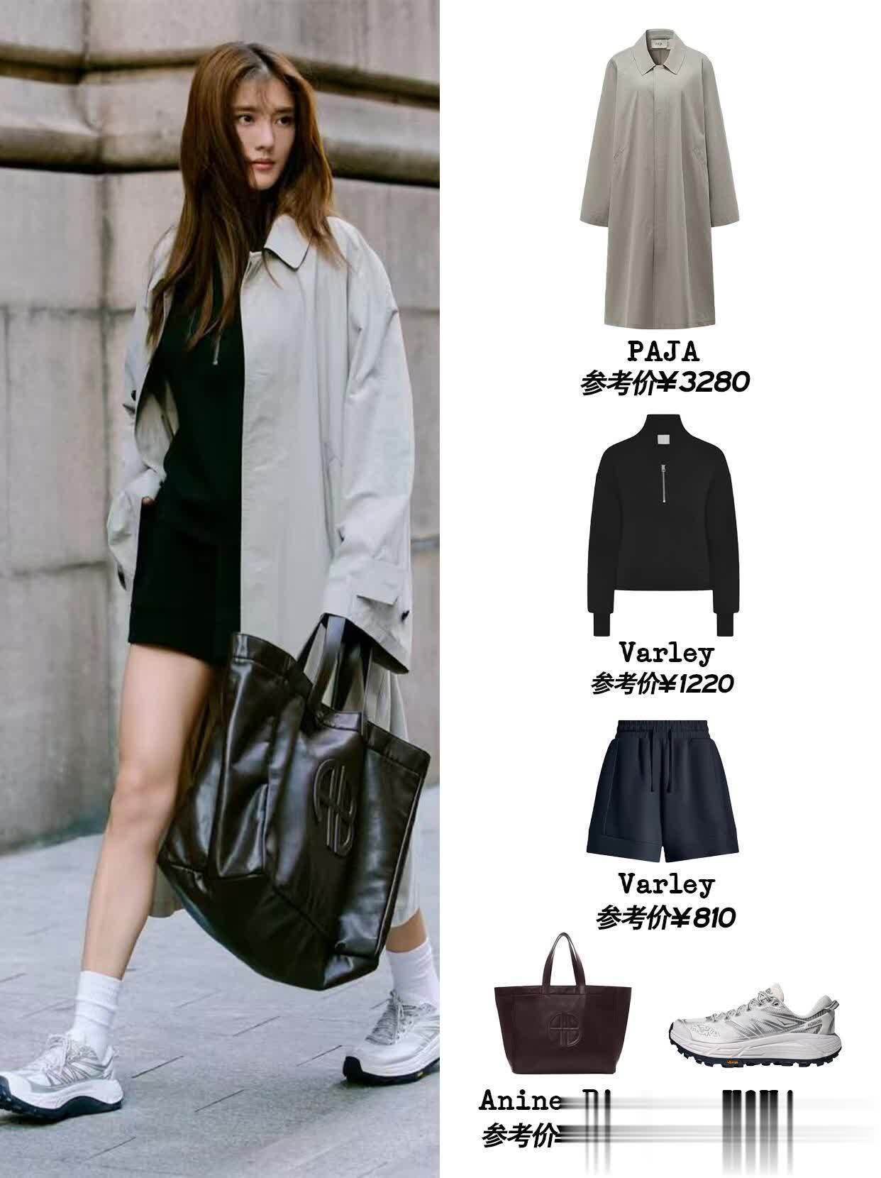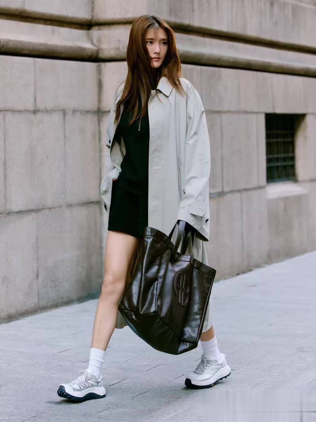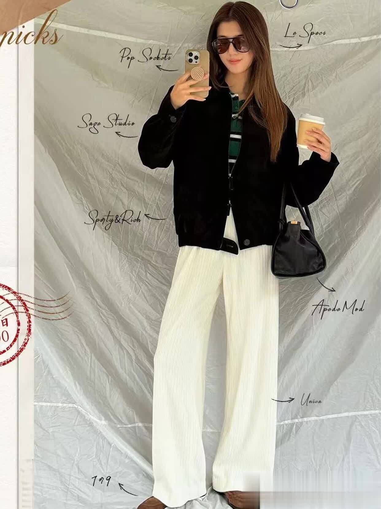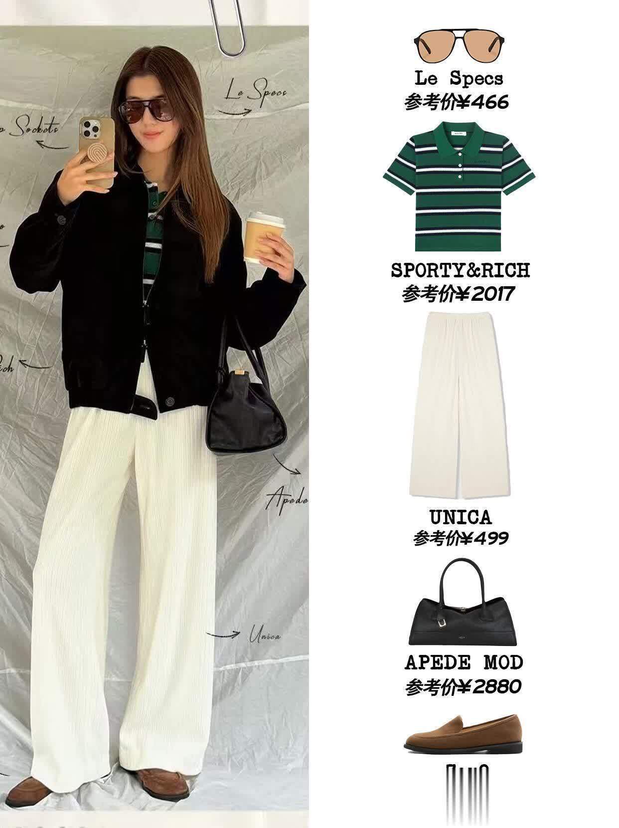 最戳我的是她的配色思路,永远不超过三个颜色,而且擅长用同色系深浅搭出层次感。比如一身奶白色套装,内搭选稍深一点的米白打底,鞋子再用浅棕色点缀,温柔得像块棉花糖;或者用黑色小吊带配深灰色阔腿裤,外搭件浅灰色针织开衫,冷的时候把开衫扣两颗扣子,热了就敞开,慵懒又自在。