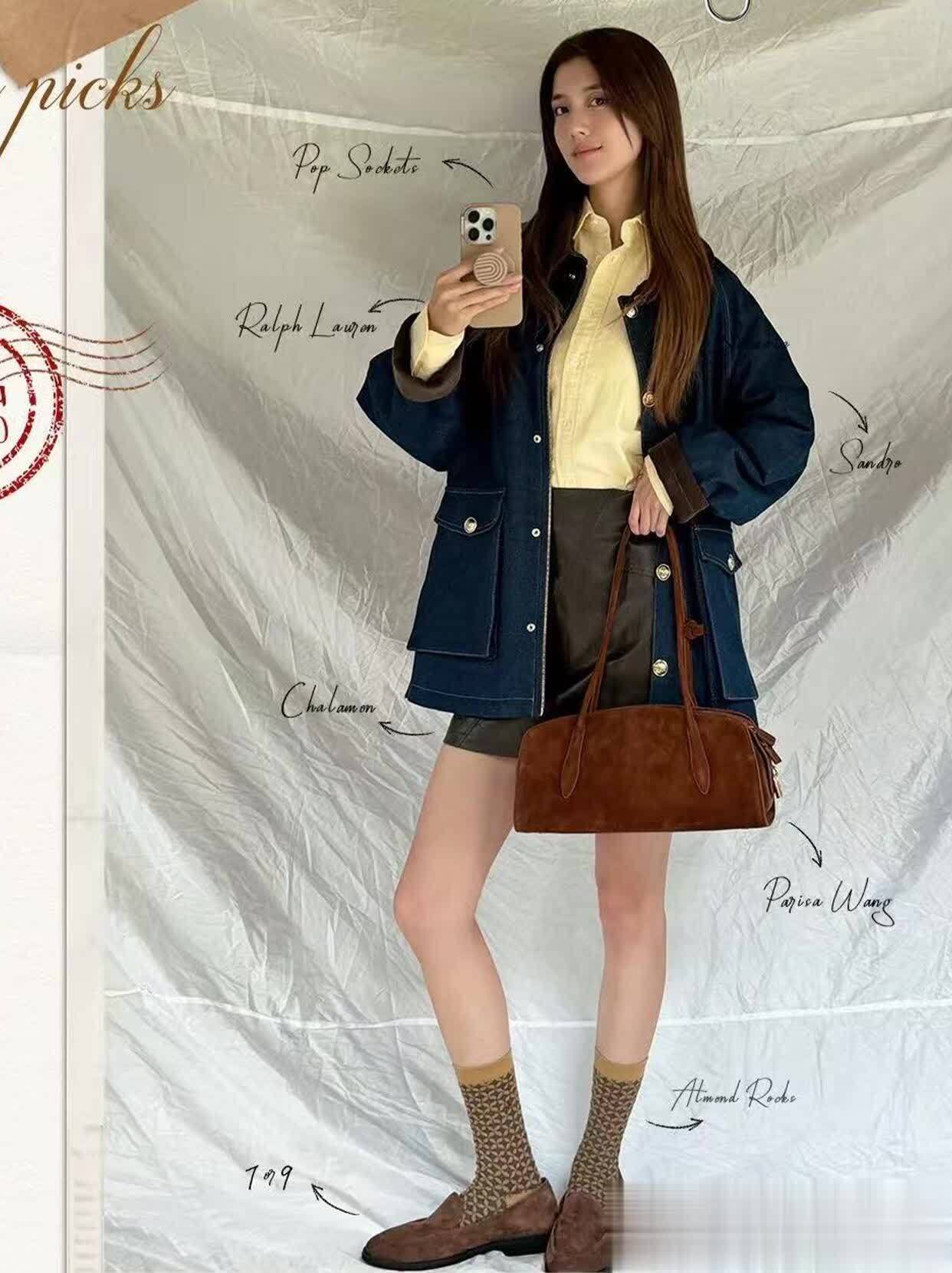 还有她穿牛仔外套的样子,选的是那种有点做旧的浅蓝色,袖口故意卷到小臂,露出手腕上叠戴的细手链。里面搭件白色吊带,下身配条高腰直筒牛仔裤,裤脚卷两圈露出脚踝,踩双帆布鞋,随性得像刚从大学校园走出来的学姐。关键是她把牛仔外套的领口往下拉了点,露出精致的锁骨,一下子就把休闲感和小性感平衡得刚刚好,普通女孩学这个细节,立马摆脱路人感!