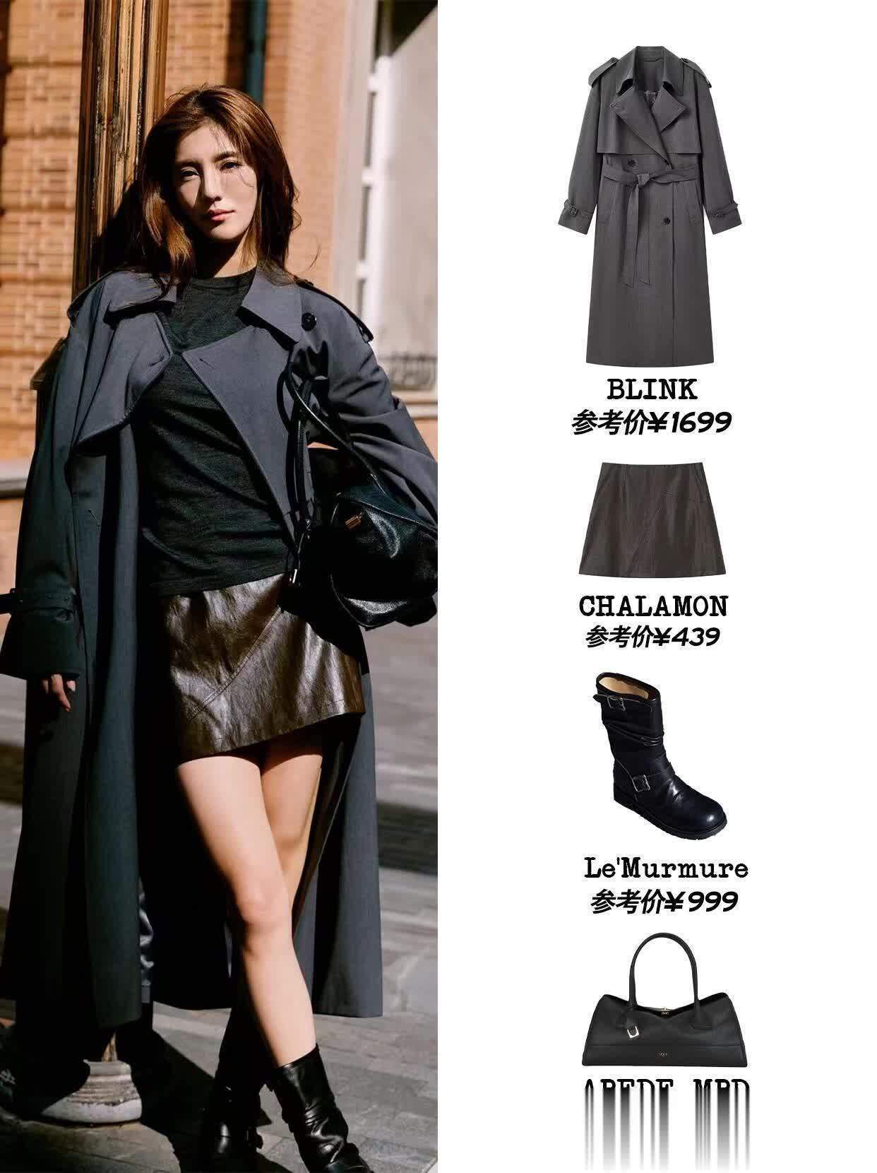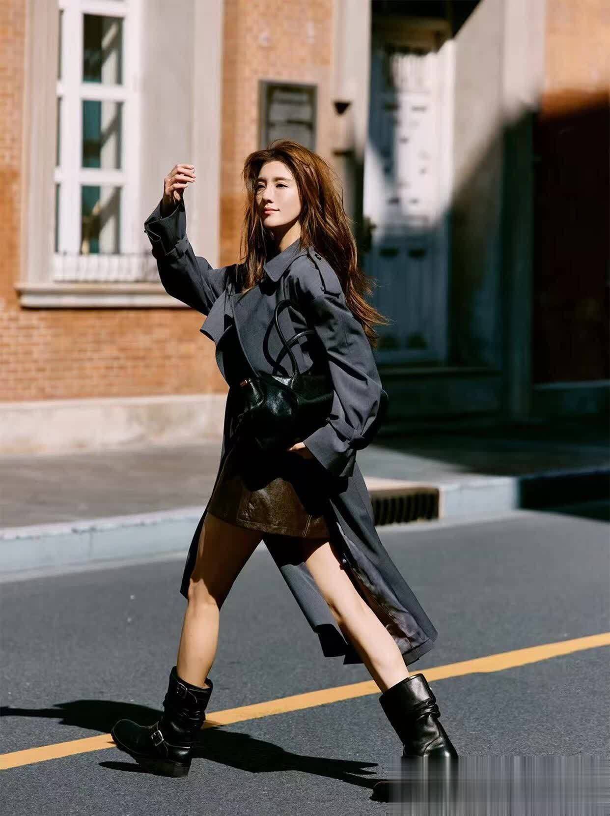 就说她最近那套焦糖色针织套装吧,短款上衣刚好露腰,配同色系高腰阔腿裤,裤脚轻轻堆在脚踝上,踩一双棕色短靴,把“上短下长”的比例玩得明明白白。最绝的是她外搭的那件浅卡其风衣,长度到大腿中间,敞开穿露出里面的套装,既保暖又不压个子,走在街上风一吹,风衣下摆轻轻飘起来,慵懒又带点飒气,黄皮姐妹大胆冲这配色,显白到发光!